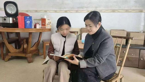 2024年12月14日,曾丽媛(右)到结对儿童家中了解生活和学习情况,并辅导学业。