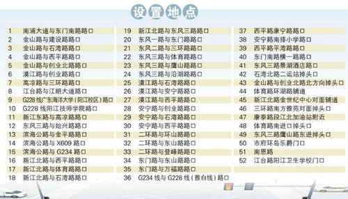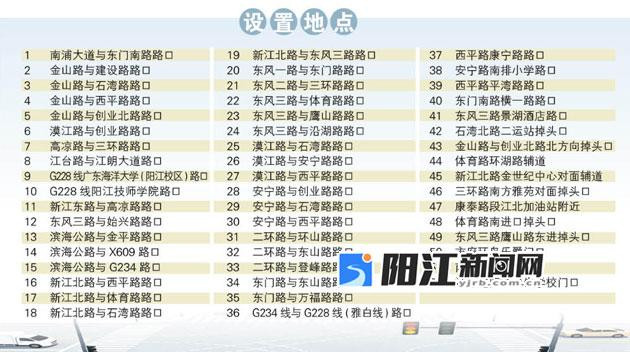 此次启用的监控设备分布于南浦大道与东门南路路口、金山路与建设路路口、广东海洋大学(阳江校区)路口、阳江技师学院路口等52个点位,覆盖江城区主要交通干道、学校周边及重点路段(详见右表)。启用监控设备抓拍不戴头盔违法行为,旨在通过科技手段强化执法,预防和减少交通事故伤亡,保障道路交通安全、有序、畅通。