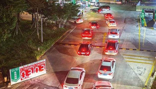 3月9日晚上10时,市区金山路某加油站,车辆正在排队加油。梁文栋 摄