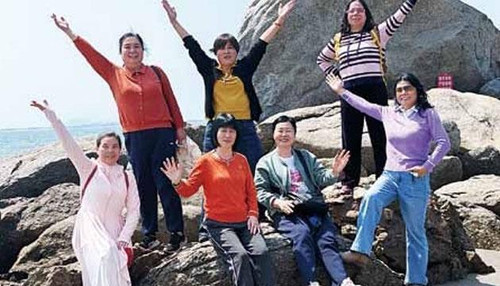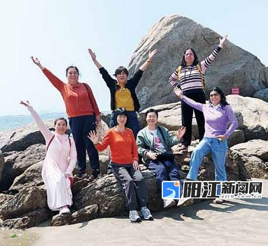 妇女们结伴到阳西县沙扒湾游玩。皮皮 摄