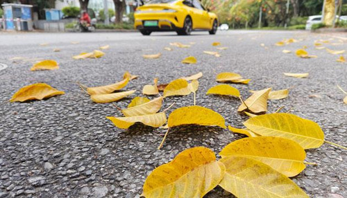 在市区环湖路,路面散落枯黄的树叶。官文婷 摄