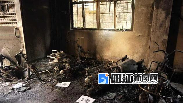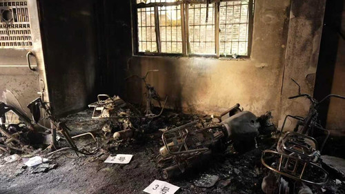 发生火灾的出租屋一楼,多辆摩托车被烧毁。市消防救援局供图