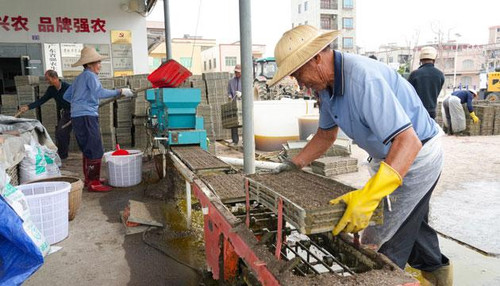 儒洞镇边海村,工作人员正在整理已经制作完成的育秧盘。 袁荣泽 摄