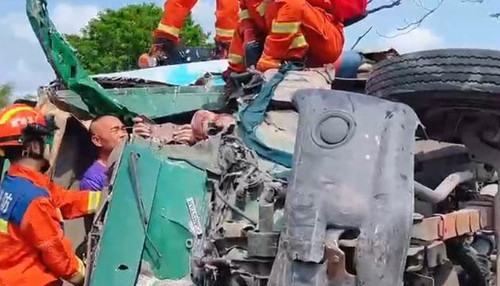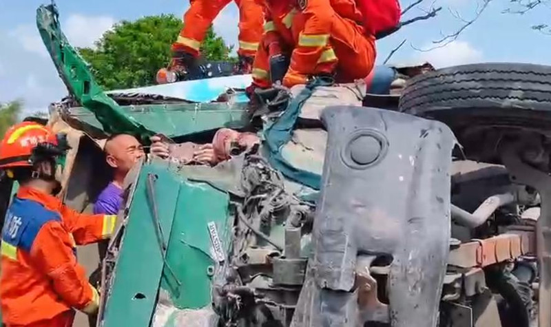 据参与现场救援的消防员介绍,事故中追尾货车的驾驶室因撞击严重变形,司机腿部被卡住,且因车身侧翻,其整个人倒悬在驾驶室内,只能靠双手强撑着身体,处境十分危险。此时,现场一名身穿紫色上衣的男子主动上前施救。他从变形的缝隙中挤进驾驶室,用力托扶住被困司机,有效减轻司机的疼痛,并避免司机因长时间倒悬造成二次伤害。