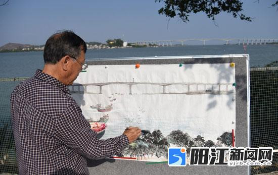 郑卫国在对岸现场创作广东滨海旅游公路北津港大桥“一桥飞架”画作。