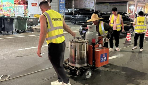 话音刚落,一名工人推着热熔划线车沿着放样粉的轨迹匀速前行。热熔划线车上装有保温加热桶,里面的涂料经货车上的热熔釜加热,温度保持在180度以上。热熔划线车推过的地方,白色的涂料在水泥路面上均匀铺开,边缘齐整。路灯下,刚划好的线泛着一层细密的光——那是混在涂料里的玻璃珠在反光。虽是凉爽的夏夜,但现场工人仍能明显感觉到热熔划线车向外辐射的热量。“时间长了对人是个考验。”叶胜说。