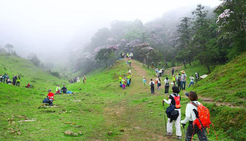 当天上午,记者来到鸡笼顶千年杜鹃林,环顾四周,一棵棵杜鹃花开得正盛,像泼上了浓浓的紫,美艳而脱俗。虽然距离开赛还有5天,但赛道已经热闹起来了,各地登山爱好者齐聚鸡笼顶,越高山、过草原、赏杜鹃,用一张张照片定格下“花开时刻”;也有三五好友坐在草地上,静静感受大自然的气息,享受休闲时刻。
