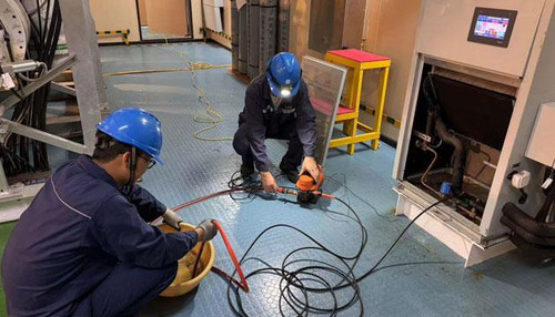 运维人员正在进行空调排水管堵塞疏通。吴浩东 党海林 摄