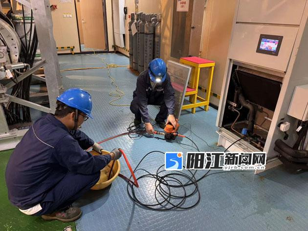 清晨6点,天还没完全亮透,阳西县沙扒镇附近海域的码头已经亮起点点灯光。一艘运维船正在做离港前的最后检查。船上几名年轻人穿着橙红色救生衣,有条不紊地清点工具、核对工单、检查通讯设备,即将奔赴50公里外的三峡阳江青洲海上风电场。