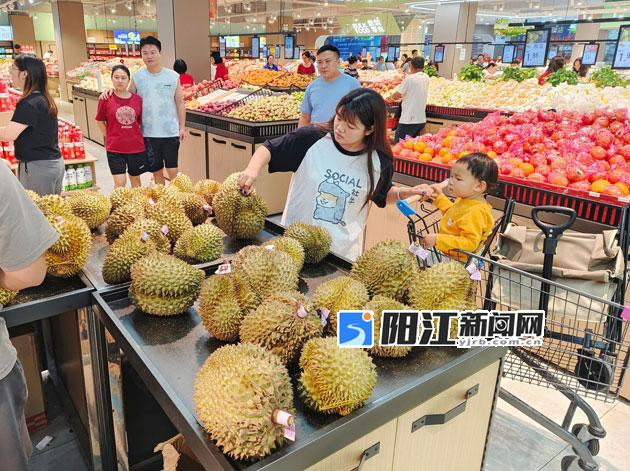 随后,记者来到位于阳东区星港汇的家家欣超市,水果区最显眼位置摆放着金枕榴莲,标价为26.9元/斤,时值周末,吸引不少市民挑选。销售员介绍,目前超市售卖的榴莲以金枕榴莲为主,该品种核小肉多,因性价比高,更受市民欢迎。
