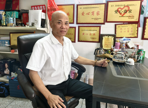 走进杨光声位于春城街道的净水器店铺,满墙的荣誉牌匾和志愿活动照片无声地“讲述”着他多年的公益足迹:志愿者服务队送来的“爱心商家”牌匾、乡镇小学送来的“热心公益 爱心助学”称赞、敬老院送来的“感谢状”……成为他善行路上的一个个注脚。