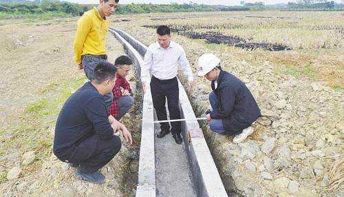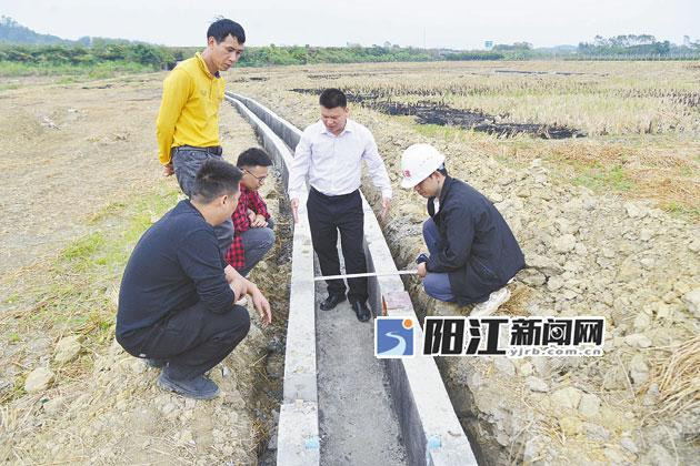 秋收过后的农田并不“闲”,挖掘机在疏通灌渠,工人手拿锄头、铁铲平整土地,为搭建模板、铺设水泥做好准备,通过高标准农田建设,确保耕地数量有保障、质量有提升。走到一条铺设了一半的80厘米宽的渠道旁,大家忽然停下了脚步,目光紧盯垫层砂石的厚度和渠道底部水泥的厚度。“铺设水泥后,会不会把垫层压薄了,不符合标准?”阳春市农业农村局总农艺师莫国潘率先发出了疑问。